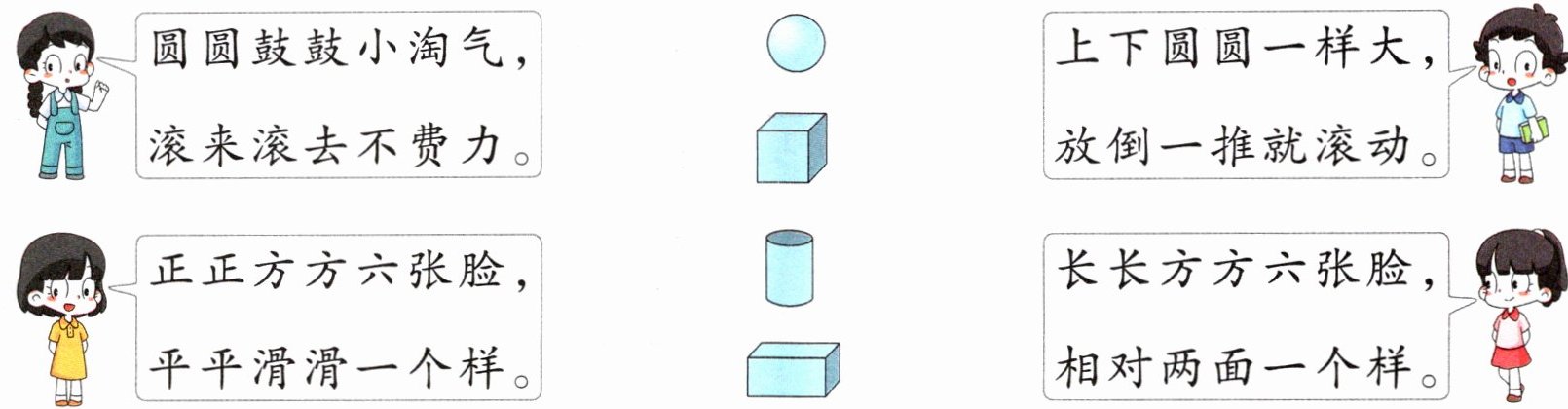 1. 圆圆鼓鼓小淘气,滚来滚去不费力。正正方方六张脸,平平滑滑一个样。上下圆圆一样大,放倒一推就滚动。长长方方六张脸,相对两面一个样。