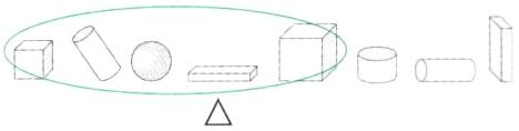 4. 把左边的5个图形圈起来;从右边数,在第5个图形的下面画“△”。