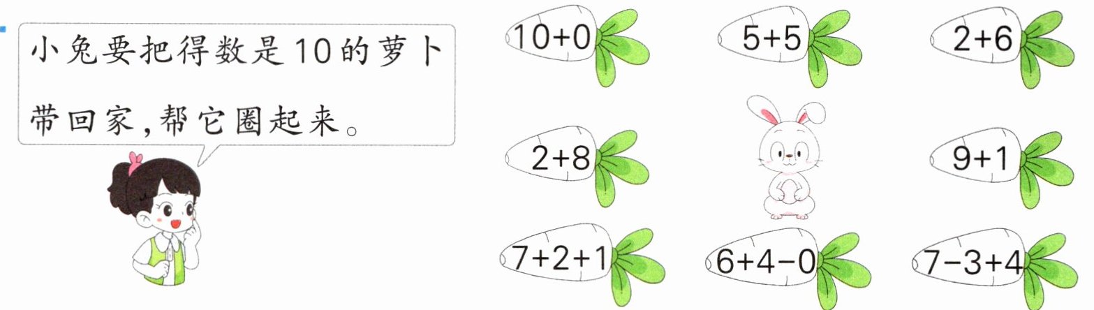 2. 小兔要把得数是10的萝卜带回家,帮它圈起来。