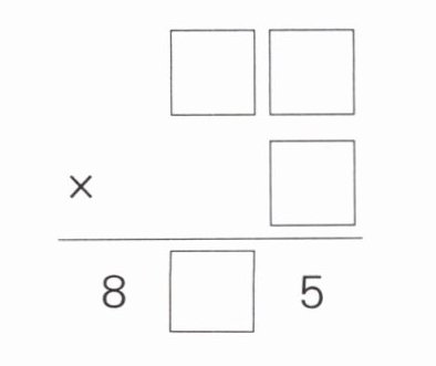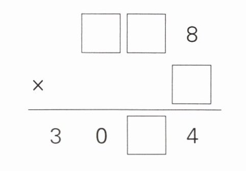 解析:第一个算式的积的个位上是5,所以两位数的个位上是5或一位数是5,如果一位数是5,积的百位上不可能是8,所以两位数的个位上是5;再想几十和几相乘是800多,只能是90和9相乘,所以两个乘数分别是95和9,积是855。第二个算式的积的个位上是4,想8乘几的积的个位上是4,所以一位数是3或8,但是如果一位数是3,积不可能是3000多,所以一位数是8;再想积的千位上是3,百位上是0,所以三位数的百位上只能是3;8×3=24,十位上的进位数应为30-24=6,想8和几的积加上6是60多,所以十位上的数应为7,积是3024。