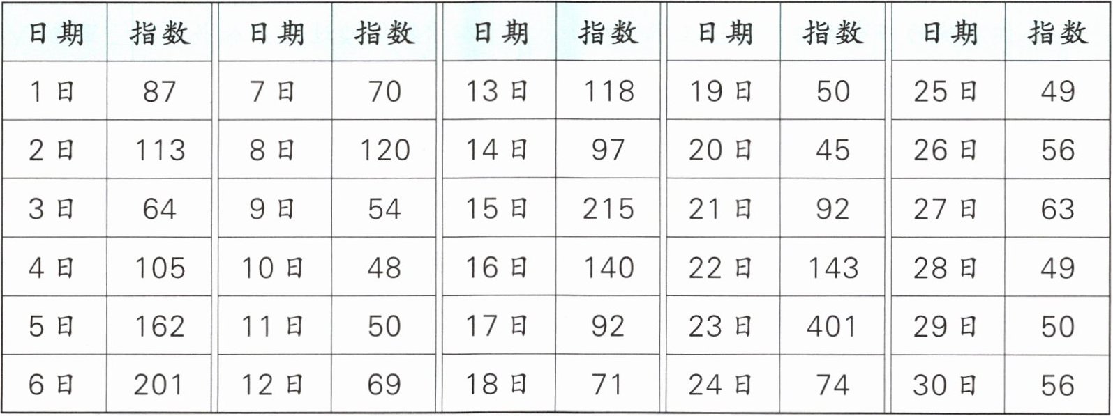 1.(名校期末真题)今年4月某城市每日发布空气质量指数的情况记录如下。