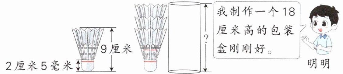 解析:叠在⼀起的3个⽻⽑球的⾼度实际上⽐⼀个⽻⽑球的⾼度要多出2个2厘⽶5毫⽶,只要⽤⼀个⽻⽑球的⾼度加上2个2厘⽶5毫⽶即可求出包装盒的⾼度,再和明明的说法⽐较即可。