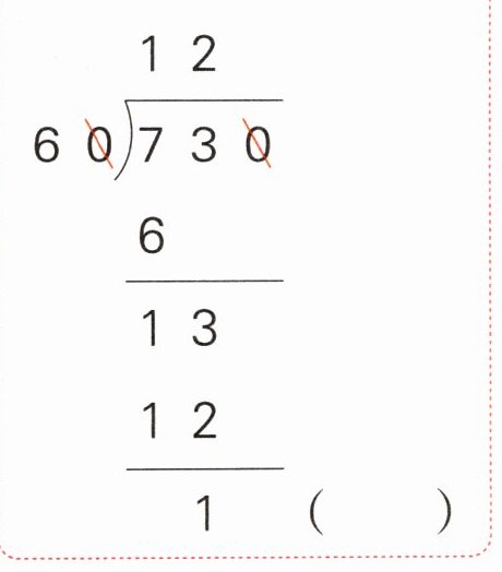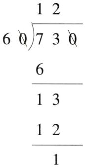 $\begin{array}{r} 12\\ 60\enclose{longdiv} {730}\\ 6\\ \hline 13\\ 12\\ \hline 1\end{array} $( )