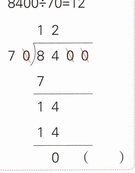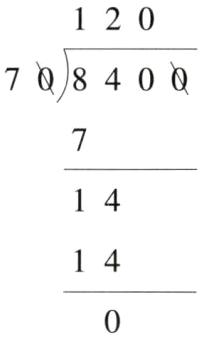 $\begin{array}{r} 12\\ 70\enclose{longdiv} {8400}\\ 7\\ \hline 14\\ 14\\ \hline 0\end{array} $( )