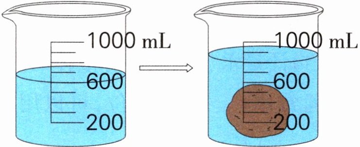 4. 左边的量杯里有多少毫升水?土豆占的空间相当于多少毫升水?
