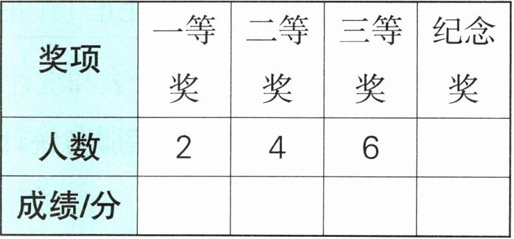 解析:一共20人,一等奖2人,二等奖4人,三等奖6人,所以纪念奖有20-2-4-6=8(人);根据参赛同学的成绩由高到低的顺序和奖项人数合理设定分数段即可。