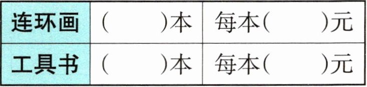 1. 鹏程逛文化市场,买了3本工具书、10本连环画和8本故事书。已知每本工具书18元,每本连环画3元,每本故事书5元。先列表整理,再解答。