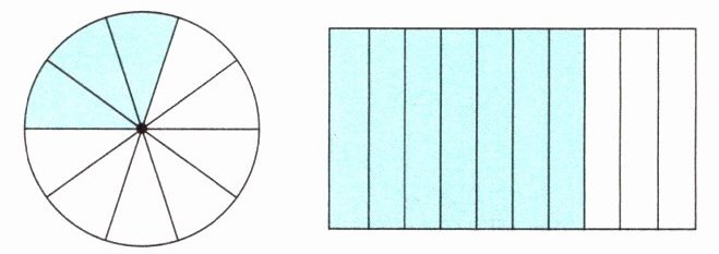 1. 下面每个图形都表示整数“1”,把涂色部分分别用分数和小数表示出来。