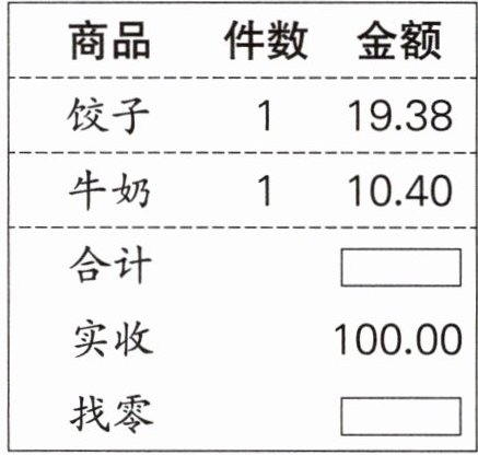 解析:由题图可得李芸买饺子花了19.38元,买牛奶花了10.40元,求合计金额就是把19.38和10.40加起来,列式为19.38 + 10.40 = 29.78(元);李芸付款100元,求找零金额就是用100减去29.78,列式为100 - 29.78 = 70.22(元)。