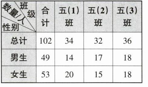 |数量/人性别班级|合计|五(1)班|五(2)班|五(3)班|