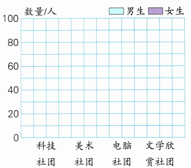 | 数量/人 | 组别 | 合计 | 科技社团 | 美术社团 | 电脑社团 | 文学欣赏社团 |