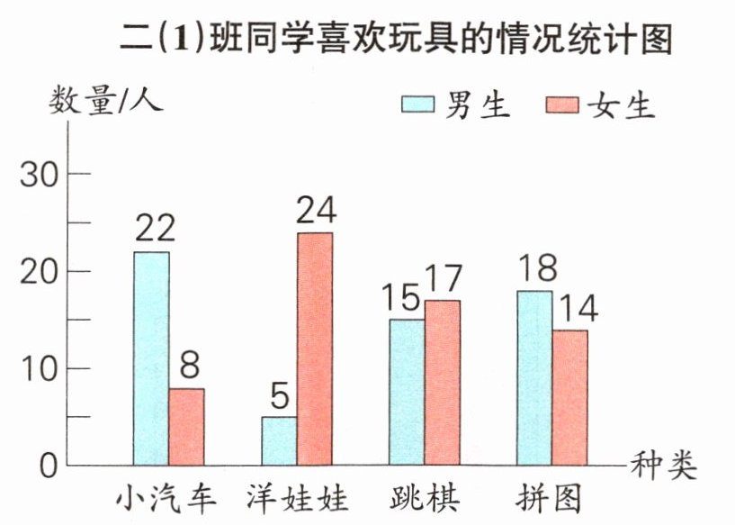 3.(答案不唯一)喜欢小汽车的男生人数最多,喜欢洋娃娃的女生人数最多,喜欢拼图的男生比女生多4人。
