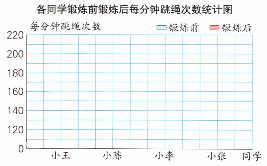 二、锻炼身体可以增进健康,增强体质。五(1)班有4名同学在暑假期间,每天都练习跳绳。以下是这4名同学锻炼前和锻炼后每分钟跳绳次数的数据对比。