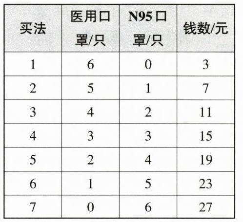 5. 药店的医用口罩每只0.5元,N95口罩每只4.5元,良良买了6只口罩,他付的钱数有哪几种不同的情况?