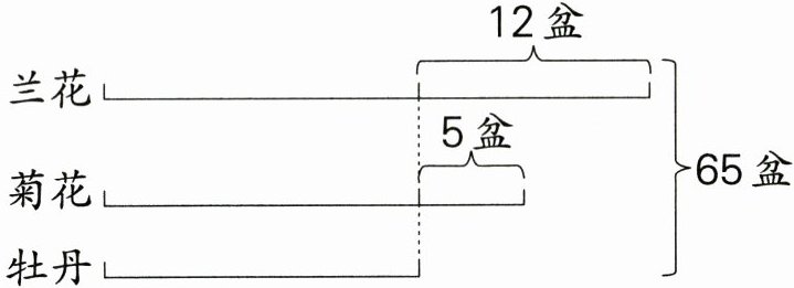 1.牡丹:$(65-12-5)÷ 3=16$(盆)菊花:$16+5=21$(盆)兰花:$16+12=28$(盆)2.大杯:$(880+140× 3)÷ (3+2)=260$(毫升)小杯:$260-140=120$(毫升)