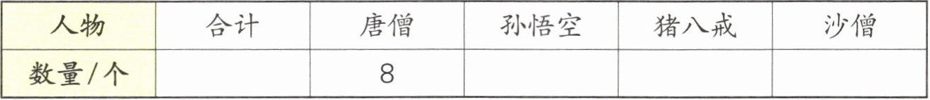 | 人物 | 合计 | 唐僧 | 孙悟空 | 猪八戒 | 沙僧 |