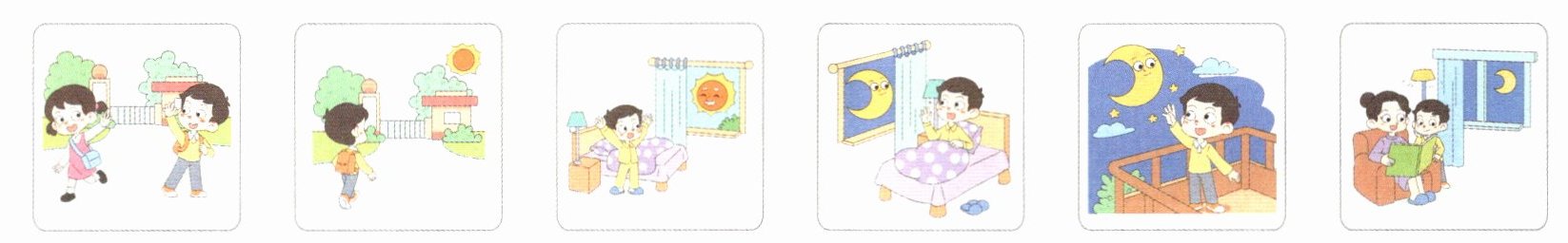 It's time to get up(起床). I say "Good morning" to Mr Sun(太阳). I have a sandwich. It's yummy. Then I go to school. Mr Sun looks at me all the time. A happy day in the school passed(过去). I say "Goodbye" to Lili. Time to go home(回家). After dinner, I say "Good evening" to Miss Moon(月亮). My mum reads a story to me. Before bed, I say "Good night" to Miss Moon.