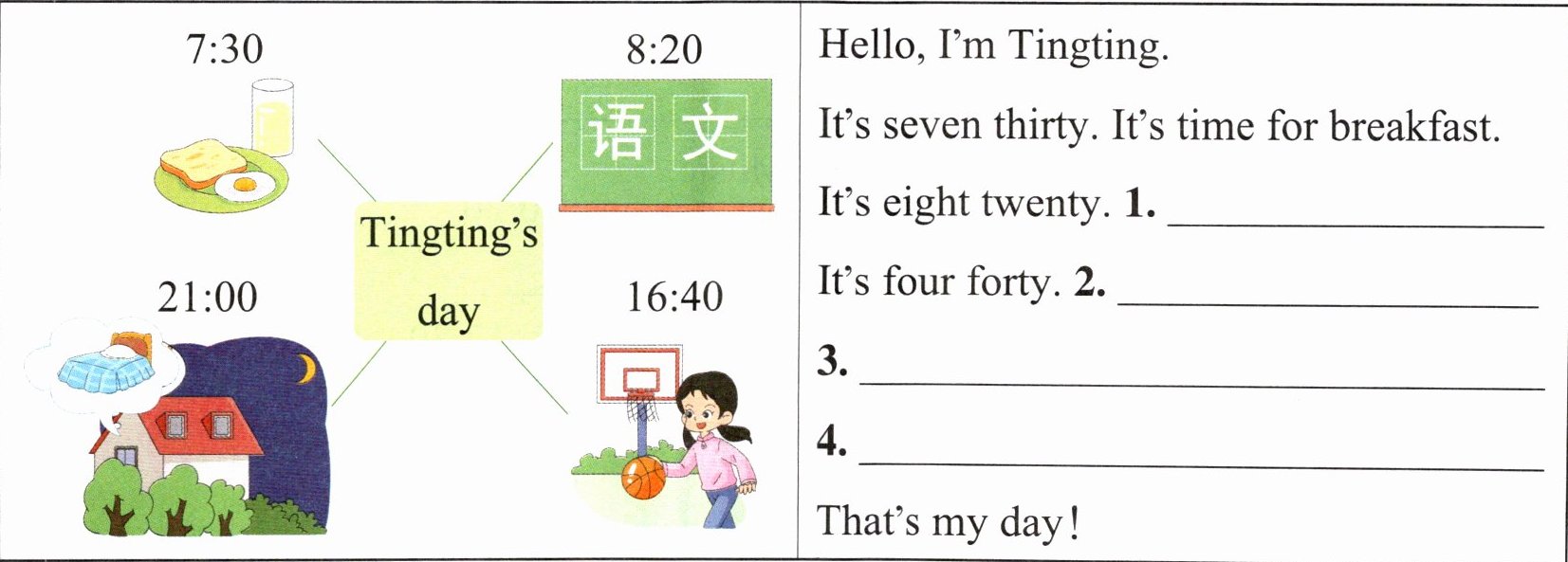 1. It's time for Chinese. 2. It's time for sport. 3. It's nine o'clock. 4. It's time to go to bed.
