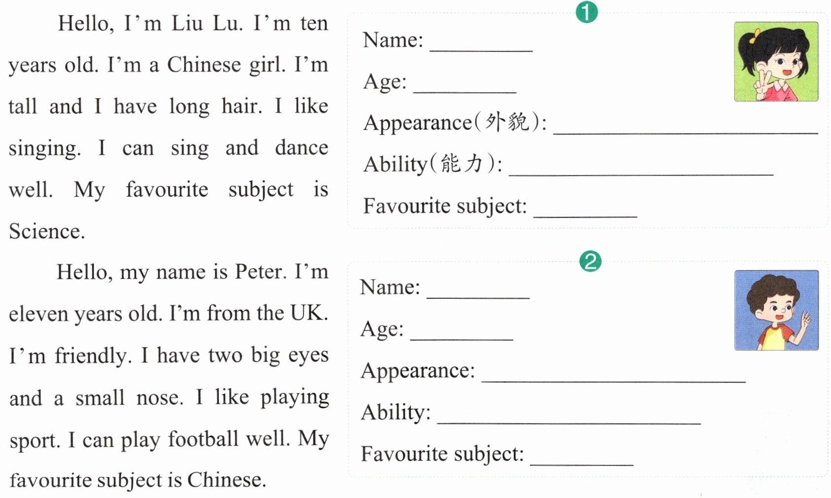 1. Liu Lu; ten; tall and have long hair; sing and dance; Science 2. Peter; eleven; have two big eyes and a small nose; play football; Chinese