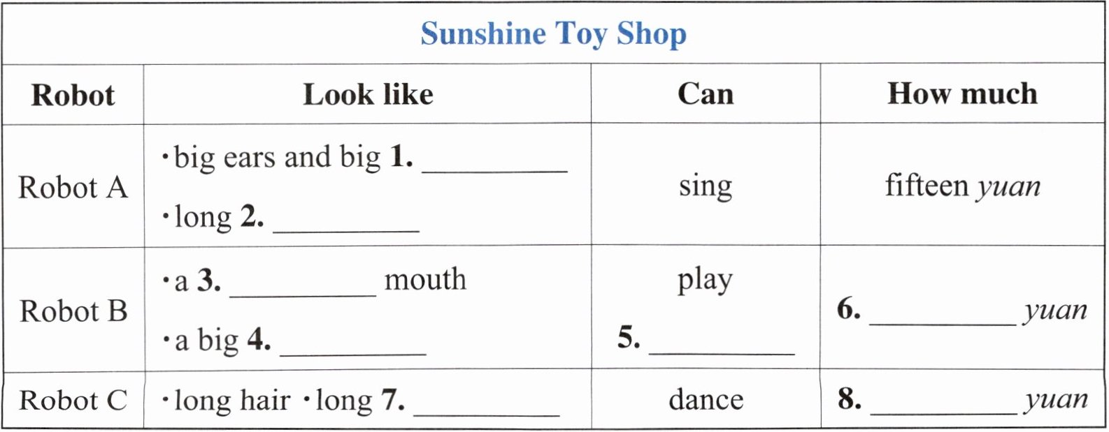 四、听录音,补全下面三个玩具机器人的信息卡。