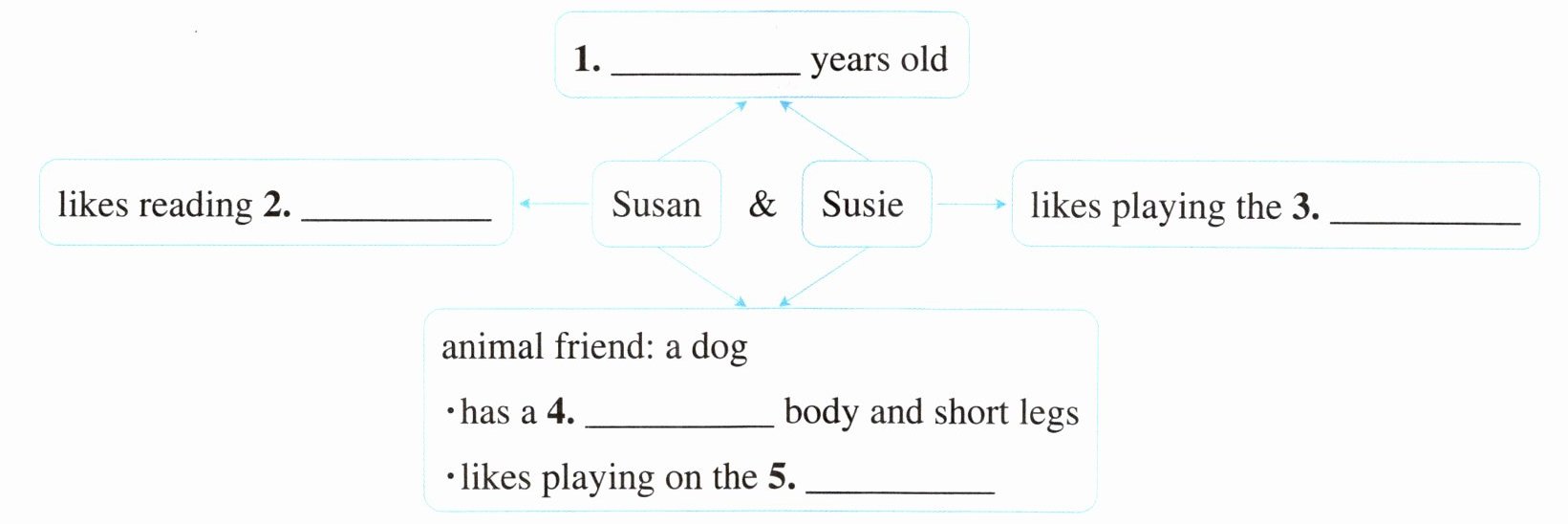 四、听录音,根据短文内容,补全思维导图中的信息,每空一词。