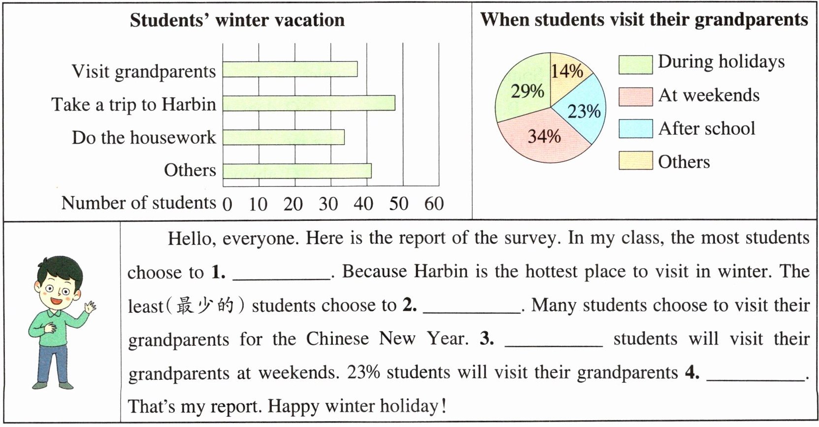 1. take a trip to Harbin 2. do the housework 3. 34% 4. after school