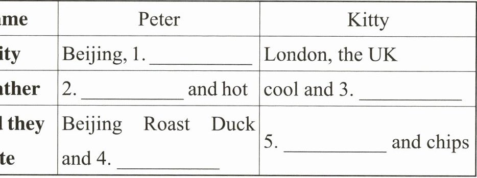 | Food they ate | Beijing Roast Duck and 4.______ | 5.______ and chips |