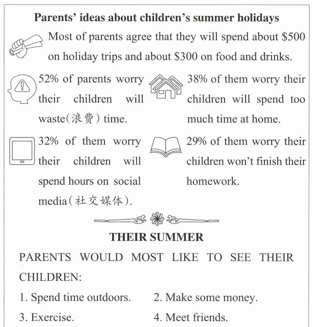 | 32% of them worry their children will spend hours on social media (社交媒体). | 29% of them worry their children won't finish their homework. |