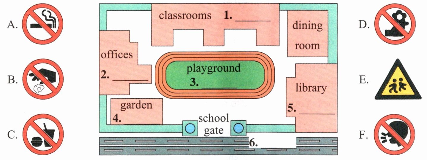 ) 1. A. No parking. B. No smoking. C. No littering.(