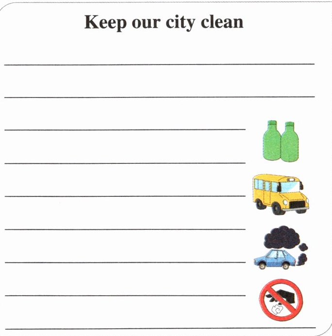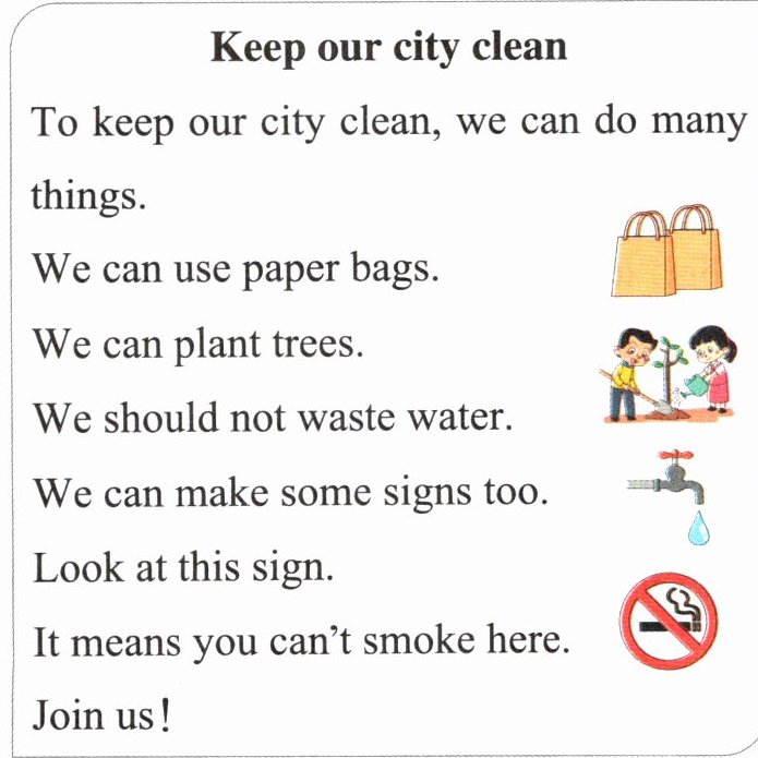 Keep our city clean To keep our city clean, we can do many things. We can use glass bottles. We can take a bus. We should not drive too much. We can make some signs too. Look at this sign. It means you can't litter here. Join us!