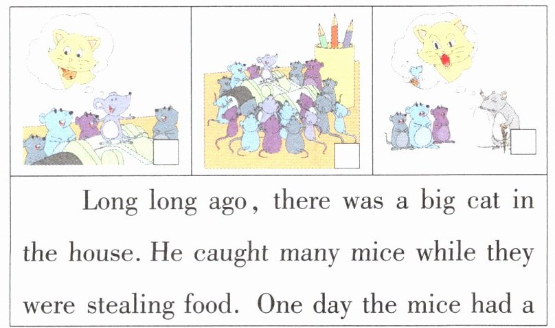 Long long ago, there was a big cat in the house. He caught many mice while they were stealing food. One day the mice had a meeting to talk about the way to deal with their common enemy. Some said this, and some said that. At last a young mouse got up, and said that he had a good idea. "We could tie a bell around the neck of the cat. Then when he comes near, we can hear the sound of the bell, and run away." Everyone approved of this proposal, but an old wise mouse got up and said, "That sounds great, but who can tie the bell to the cat?" The mice looked at each other, but nobody spoke.
