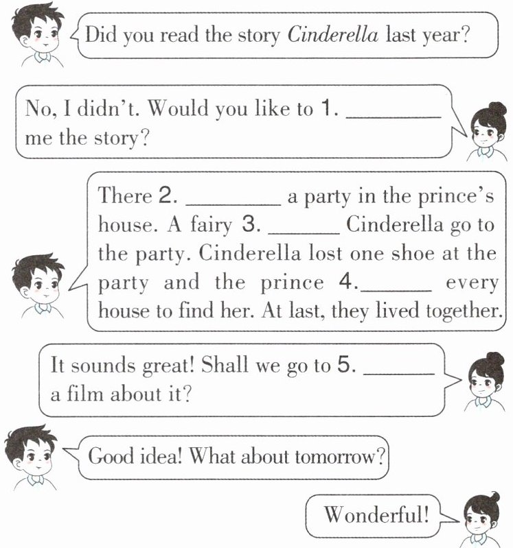 There 2. ______ a party in the prince's house. A fairy 3. ______ Cinderella go to the party. Cinderella lost one shoe at the party and the prince 4. ______ every house to find her. At last, they lived together.