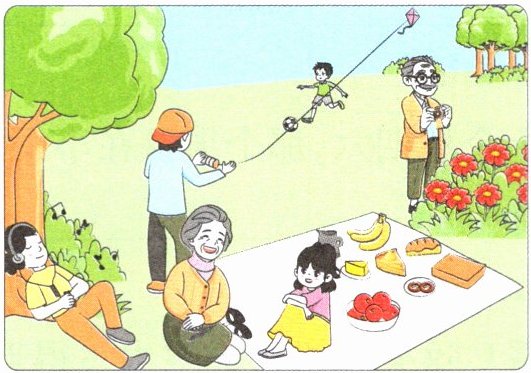 五 上周五小梅一家去公园野餐,请根据照片内容选择合适的选项,帮小梅补全日记。(有多余项)