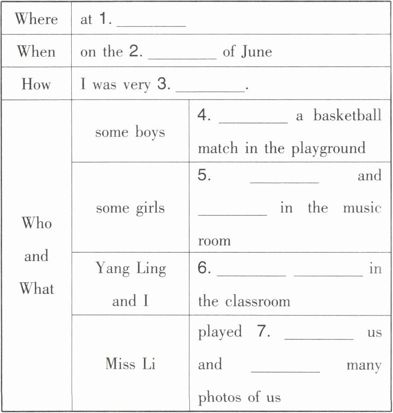 1. school 2. first 3. excited 4. had 5. sang; danced 6. played games 7. with; took (第5题前后两个答案可互换) 【译文】6月1日,星期六 今天是儿童节。我非常兴奋。我在学校度过了美好的一天。一些男孩在操场上进行了一场篮球比赛。一些女孩在音乐教室里唱歌跳舞。杨玲和我在教室里玩游戏。这很有趣。李老师也在学校里。她和我们一起玩并给我们拍了很多好看的照片。
