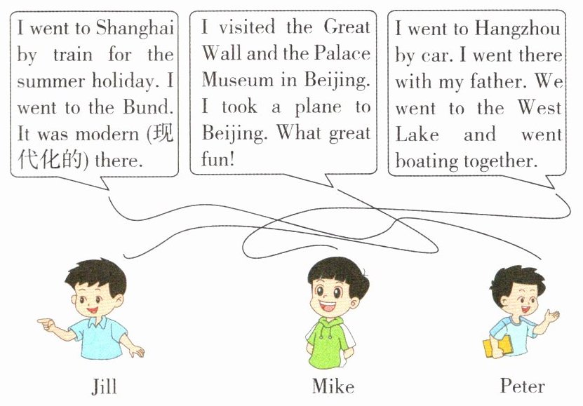 1. Jill 2. Beijing 3. Great 4. Wall 5. Palace 6. Museum 7. Hangzhou 8. car 9. boating 10. Peter 11. train 12. Bund