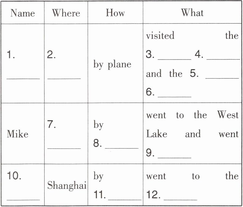 | 1._ | 2._ | by plane | visited the ____3____ ____4____ and the ____5____ ____6____ | | Mike | 7._ | by ____8____ | went to the West Lake and went ____9____ | | 10._ | Shanghai | by ____11____ | went to the ____12____ |