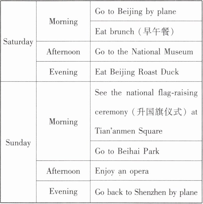 | | Morning | See the national flag-raising ceremony(升国旗仪式)at Tian'anmen Square |