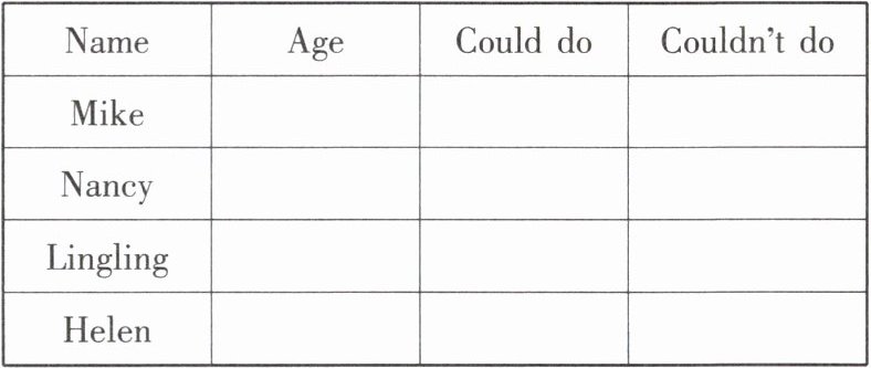 | Name | Age | Could do | Couldn't do |