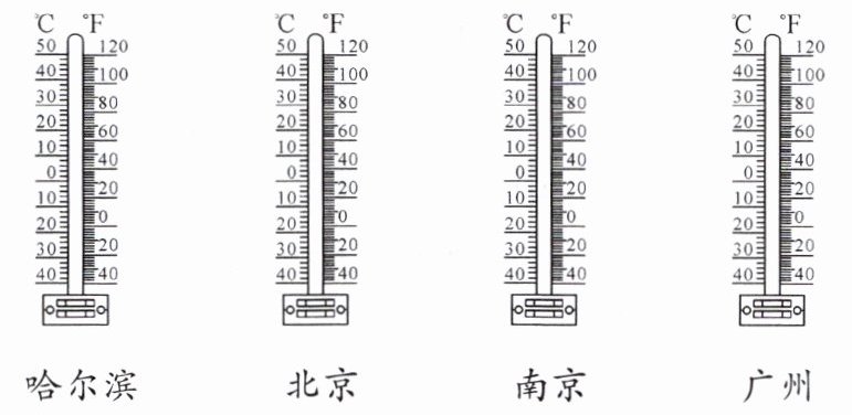 3. 某天中午12时,哈尔滨等四个城市的气温如下表。你能在温度计上分别表示出这些气温吗?