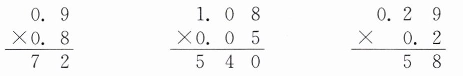 解析:题目要求用竖式计算三个小数乘法表达式。需要按照小数乘法的规则来进行计算,即先忽略小数点进行乘法,然后再根据小数点的位置确定最终结果的小数点位置。