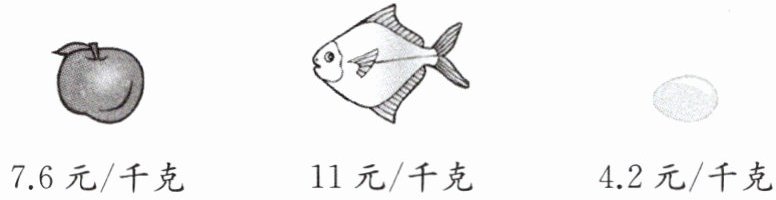 答:各买2千克,苹果要用15.2元,鱼要用22元,鸡蛋要用8.4元;各买2.5千克,苹果要用19元,鱼要用27.5元,鸡蛋要用10.5元。
