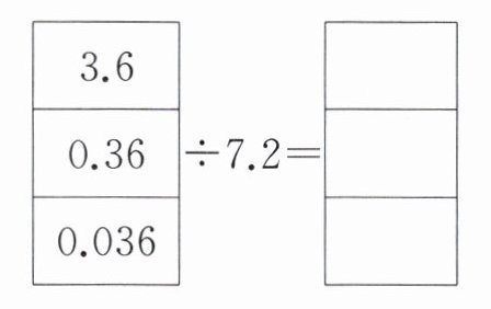 将除数$7.2$的小数点去掉变为$72$,被除数$0.36$的小数点向右移动一位变为$3.6$,则$0.36÷7.2 = 3.6÷72 = 0.05$。