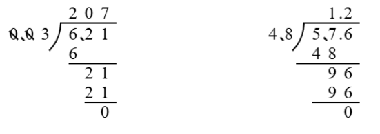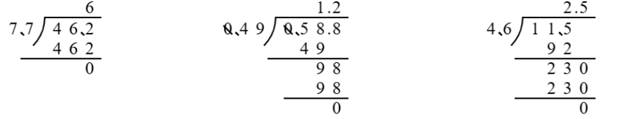 解析:本题考查除数是小数的除法计算。计算除数是小数的除法时,根据商不变的性质,先把除数的小数点去掉,使它变成整数,再看原来的除数有几位小数,被除数的小数点也向右移动相同的位数,然后按照除数是整数的除法法则进行计算。