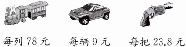 3. 几种玩具的售价如下图。玩具火车的售价约是玩具汽车的多少倍? 玩具手枪的售价约是玩具汽车的多少倍? (得数保留一位小数)