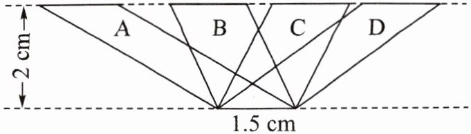 A、B、C、D四个平行四边形等底(底=1.5cm)等高(高=2cm)。