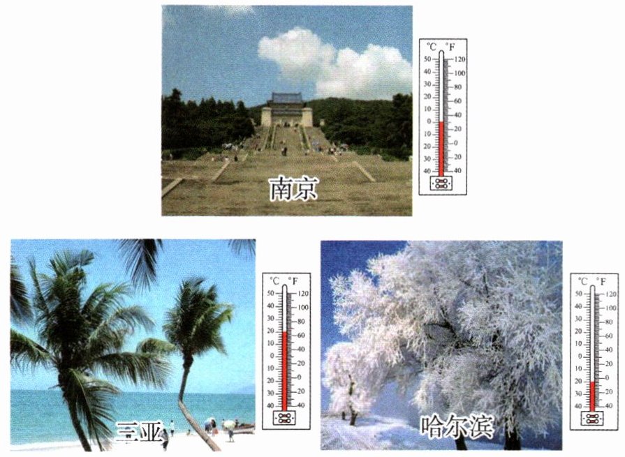 能知道南京的最低气温是10℃,三亚的最低气温是20℃,哈尔滨的最低气温是-20℃,且三亚气温最高,哈尔滨气温最低。