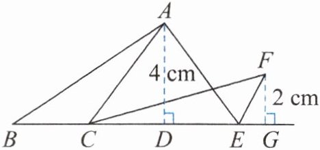 例 2 如下图,已知 $ AD = 4 \, cm $,$ FG = 2 \, cm $,$ CE = 6 \, cm $,$ BC = 3 \, cm $,求三角形 $ ABC $、三角形 $ ACE $ 与三角形 $ FCE $ 的面积,并说说你的发现。