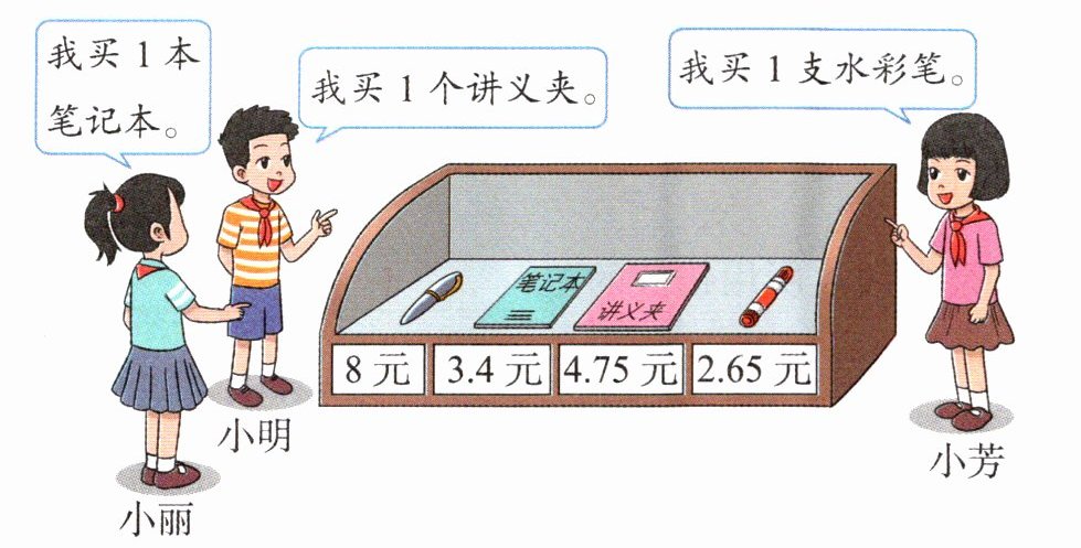 已知小明买$1$个讲义夹,价格是$4.75$元;小芳买$1$支水彩笔,价格是$2.65$元。
