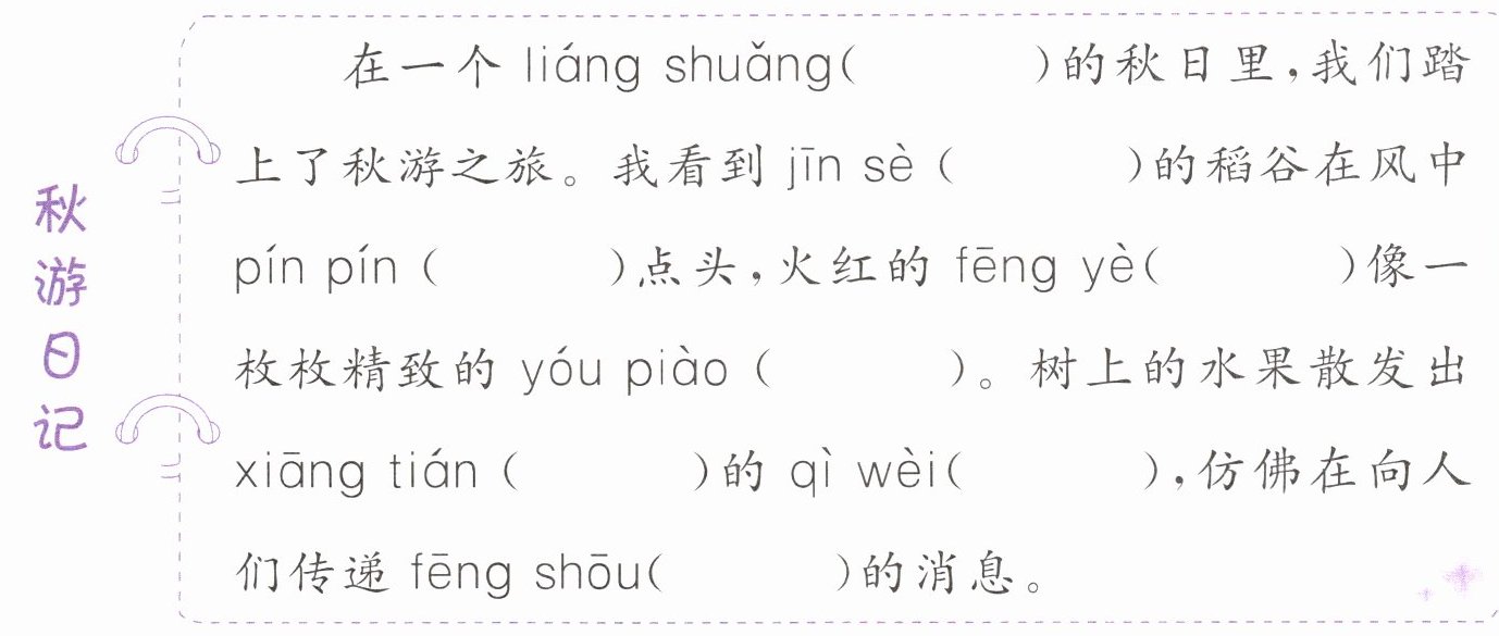 在一个 liáng shuǎng( )的秋日里,我们踏上了秋游之旅。我看到 jīn sè( )的稻谷在风中pín pín( )点头,火红的 fēng yè( )像一枚枚精致的 yóu piào( )。树上的水果散发出xiāng tián( )的 qì wèi( ),仿佛在向人们传递 fēng shōu( )的消息。