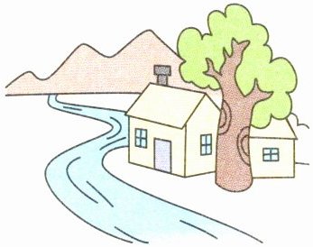 (1)远处的村庄里有几座低矮的房屋,低矮的房屋旁有一条清清的小河,